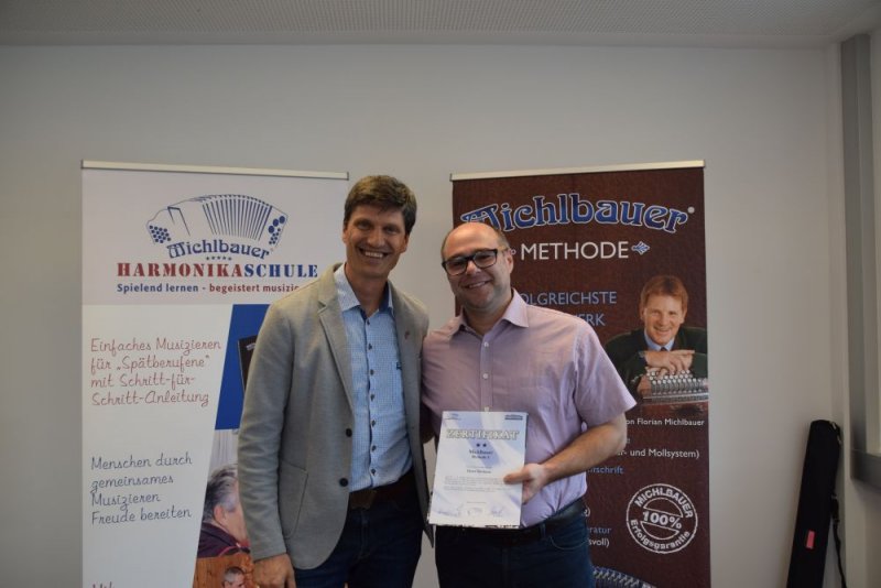 Mit dem Ansporn, „Wenn er das mit dem Alter schafft, dann kann ich das auch.“ habe ich mir einige Jahre mit meinem Vorwissen das Spiel auf der Steirischen Harmonika selbst beigebracht. Doch irgendwann kam der Punkt wo ich selbst nicht mehr weiterkam, so machte ich mich auf die Suche nach einem Harmonikalehrer und wurde bei Michlbauer fündig.