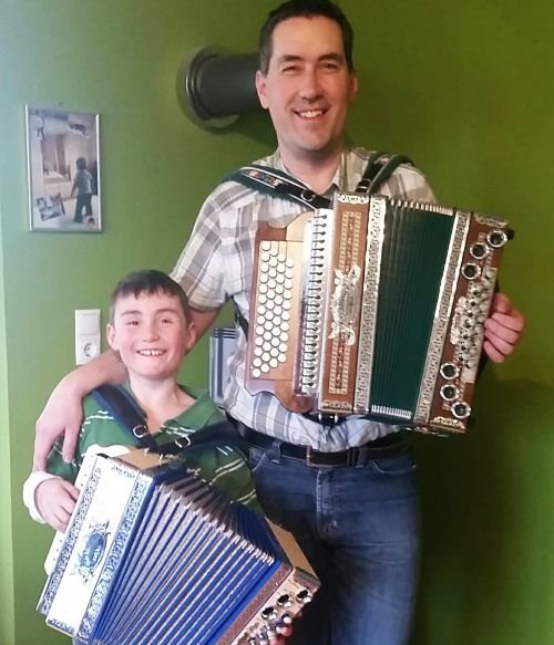 Dann habe ich mit einem Bekannten, welcher steirische Harmonika spielt, zusammen musiziert. Er hat auf der steirischen gespielt und ich auf meiner Muha. Dabei habe ich die steirische Harmonika kennen gelernt und war sofort begeistert. Also wurde so ein Instrument angeschafft, um es zu lernen. Eine echte Herausforderung aber es macht auch einen riesigen Spaß. Das Lehrbuch Band 2 habe ich mir bereits zum Geburtstag schenken lassen. Vielleicht sieht man sich mal auf einem Lehrgang bei Euch in Tirol. Aber zunächst heißt es nach wie vor üben, üben und nochmals üben.