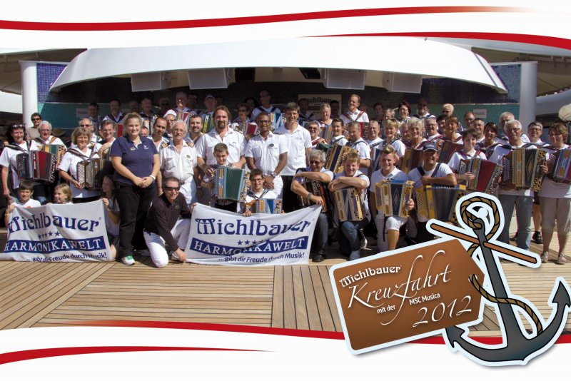 Im Herbst 2012 sind wir zusammen in hohe See gestochen und haben gemeinsam den 1. Michlbauer Weltrekord: “Die größte Gruppe an diatonischen Harmonikaspielern, die während einer Kreuzfahrt ein Ensemble-Stück erlernt und präsentiert” aufgestellt.