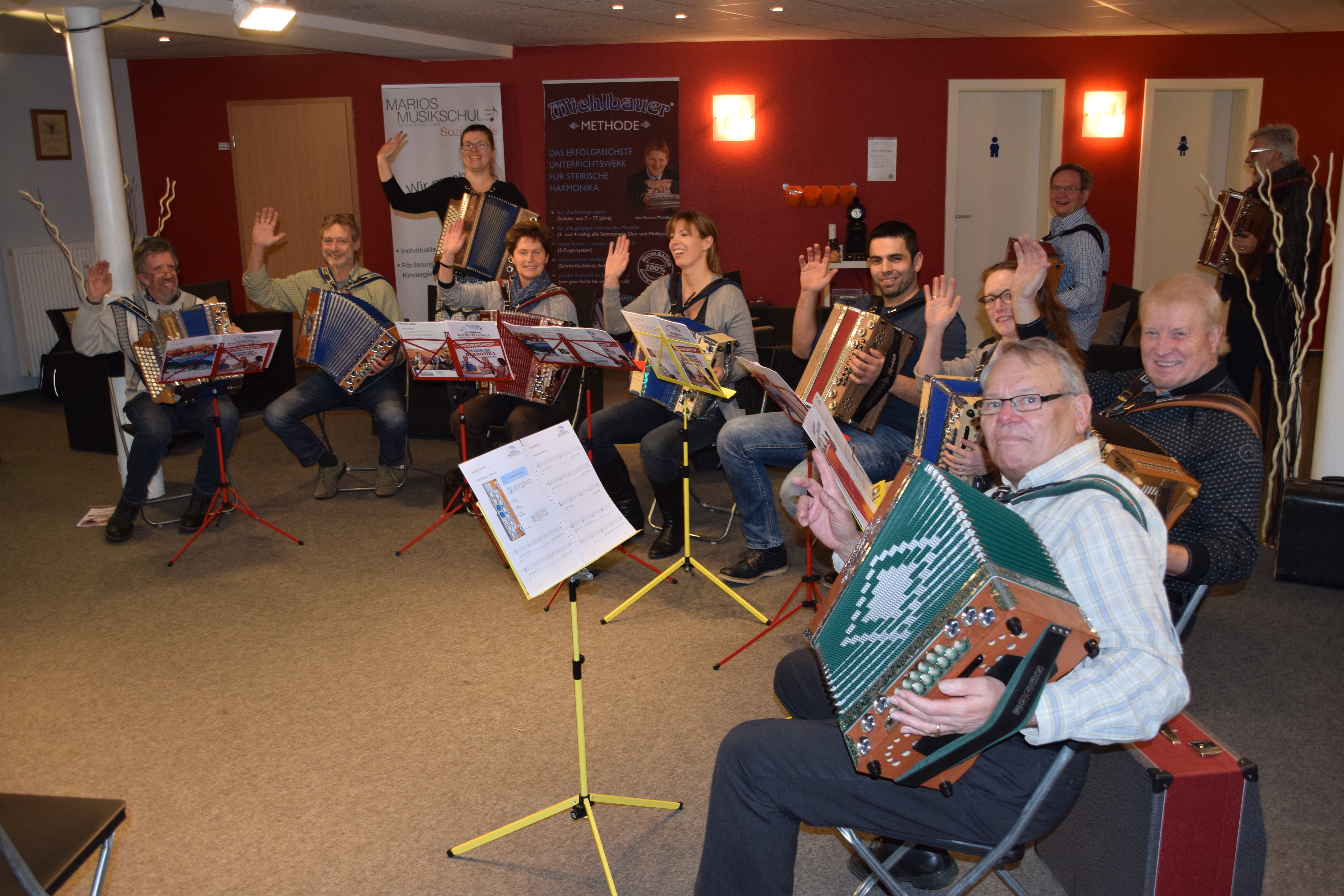 Der Siegeszug der „Steirischen“ hält weiter an . Eine gute Nachricht gibt es jetzt auch für alle Harmonika Freunde im Großraum von Bonn! Marios Musikschule bietet ab sofort auch Unterricht für die Steirische Harmonika an. Sie ist eine der größten privaten Musikschulen in Deutschland. Die ersten Kontakte zwischen der Michlbauer Harmonikawelt und Mario Müller, dem Inhaber der Musikschule und auch Präsident des Bundesverbands der freien Musikschulen in Deutschland, entstanden schon vor einigen Jahren auf dem Musikschulkongress 2014 in Hammelburg. Damals galt die Harmonika in deutschen Musikschulkreisen noch als exotisches Instrument aus dem Alpenland. Aufgrund der ständig steigenden Anfragen sah es Mario als eine spannende Aufgabe an, die Steirische Harmonika in seiner großen Musikschule ins Unterrichtsprogramm aufzunehmen. Es fehlte nur noch ein Lehrer, der das Instrument unterrichten konnte. Mit Barbara Strautmann steht nun eine engagierte Lehrerin zur Verfügung. Die nötigen Fachkenntnisse auf der Harmonika holte sie sich bei Lehrerausbildung in der Michlbauer Zentrale in Höfen. Beim kürzlich veranstalteten Einsteiger-Workshop in der Niederlassung Bad Godesberg, bei dem 15 Personen teilgenommen haben, fiel auch der offizielle Startschuss für den Harmonika-Unterricht in Bonn. Den Kurs für Einsteiger leitete die frischgebackene Harmonikalehrerin Barbara Strautmann.
