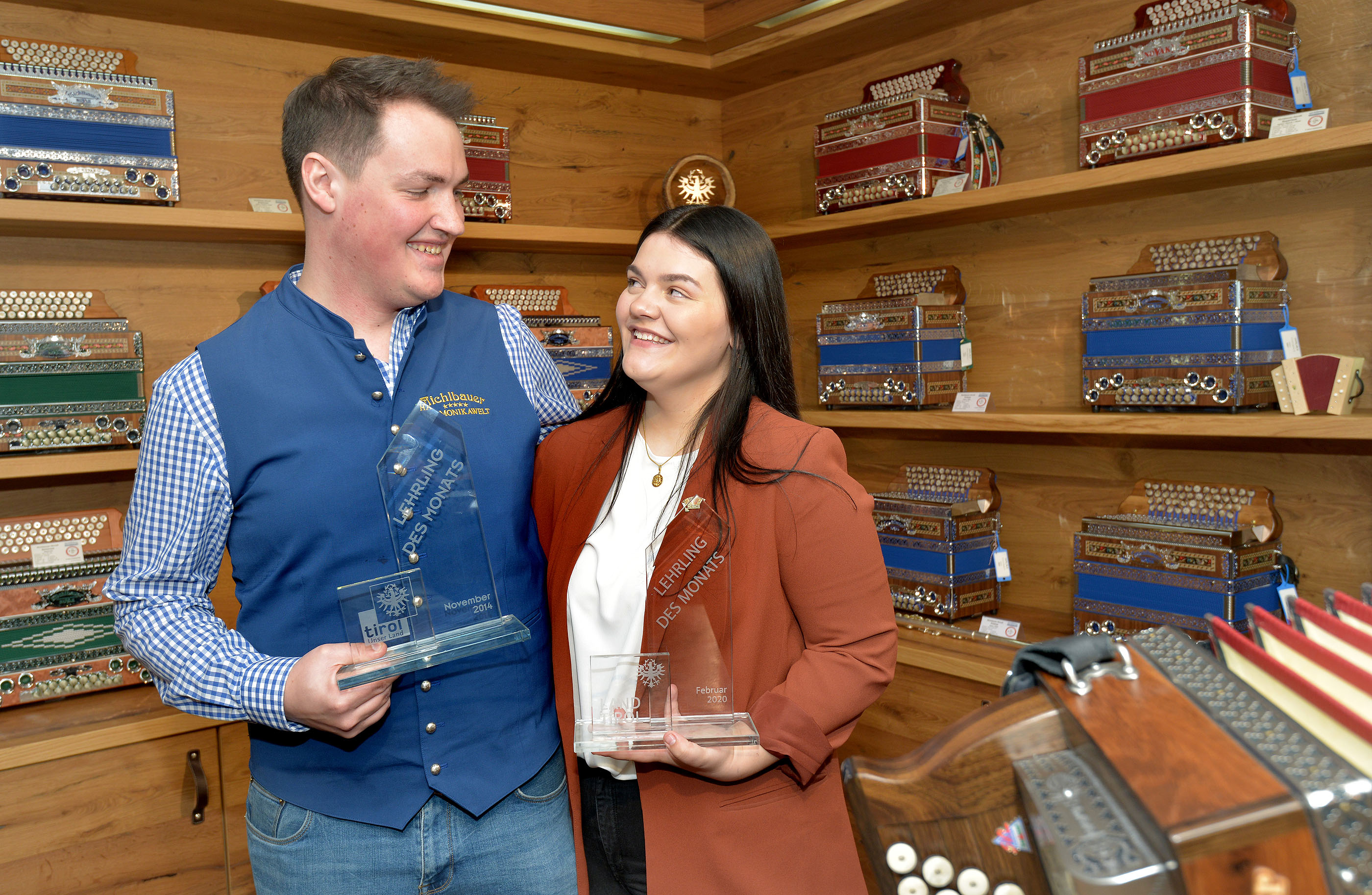 Bild 2: Stolzes Geschwisterpaar Dominic und Fabienne Schedler, beide wurden Lehrling des Monats im Betrieb Michlbauer. Dominic im November 2014 als Harmonikabauer, Fabienne als Bürokauffrau im Monat Februar 2020.