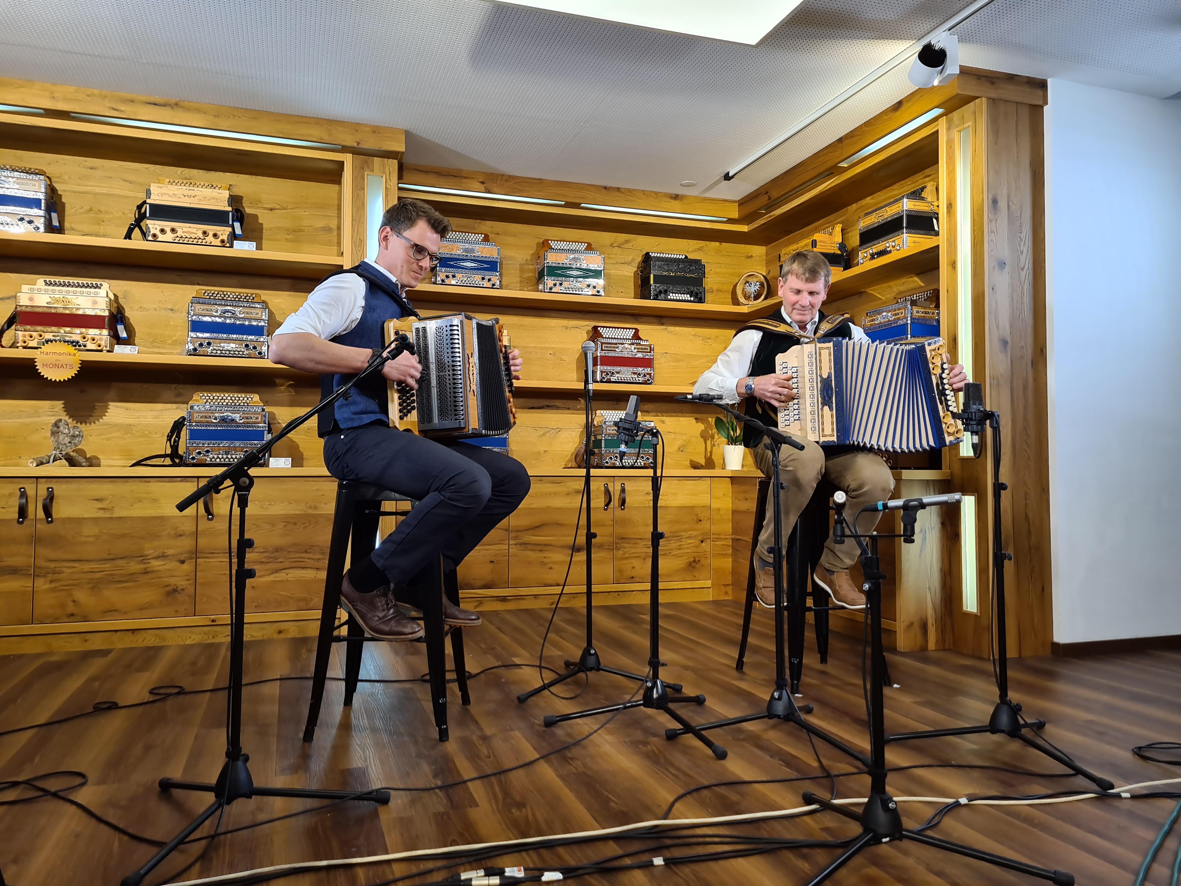 Erwin Hämmerle (li) eröffnete kürzlich die erste spezielle Harmonika-Schule in Vorarlberg. Gemeinsam mit Dominic Schedler, Harmonikabauer und Steirische-Lehrer von der Michlbauer-Harmonikawelt mit Sitz in Reutte/Tirol, zeigte er den Besuchern, was auf der Steirischen möglich ist. (Foto: Michlbauer; Abdruck honorarfrei)