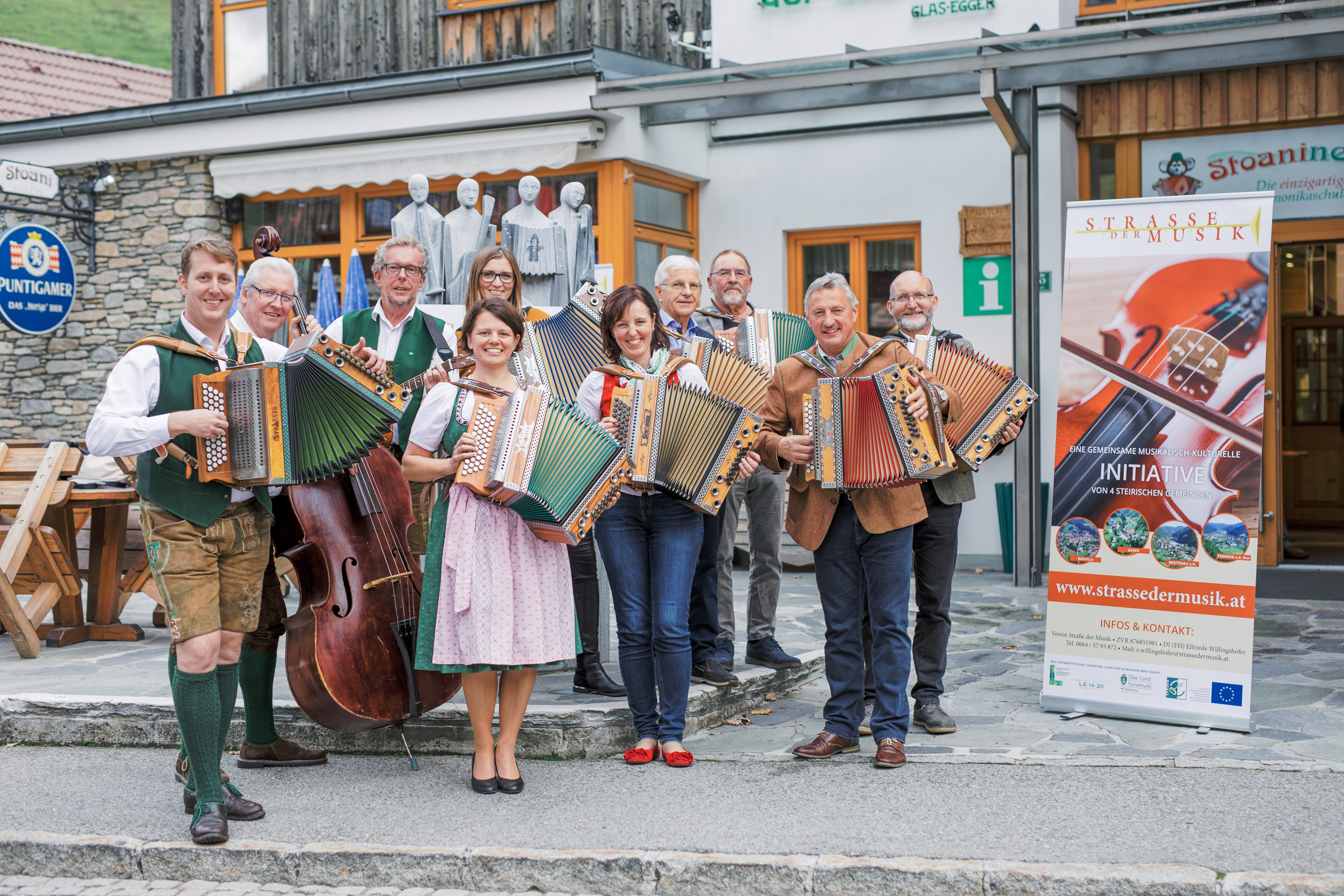 Die wissenschaftliche Bestätigung, dass Steierische spielen nachweislich die Gesundheit fördert, konnte Irmgard Kulmer (Spielerin in der Jeans, vorne) von der Michlbauer-Musikschule „Stoanieum“ in Gasen sowie die Vereinsverantwortlichen der „Straße der Musik“ kürzlich von Stressforscher Sepp Porta aus Graz (3.v.re., hinten) bei einer großangelegten Pressekonferenz entgegennehmen.