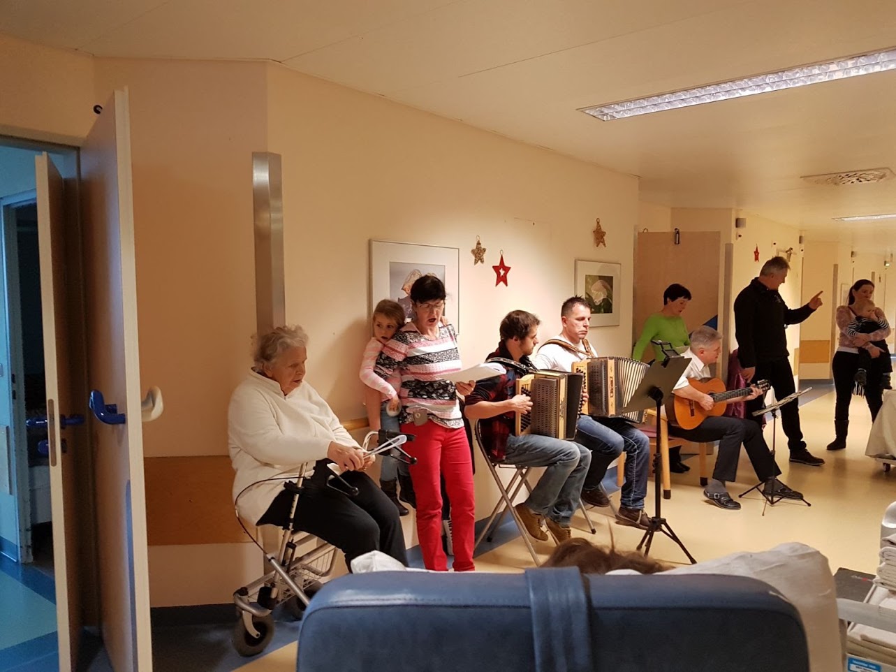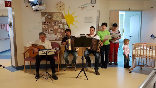 Harmonikalehrer und –schüler sorgten mit Krankenhausseelsorger Georg Rehm für weihnachtliche Klänge in den Krankenhausgängen des Bezirkskrankenhauses in Reutte. Die Patienten wurden eingeladen, wenn möglich dazu zu kommen und mitzusingen oder bei offenen Türen den Melodien zu lauschen. Die Musikanten wanderten mit den Instrumenten von Station zu Station und verbreiteten mit klassischen Weihnachtsliedern eine weihnachtliche und fröhliche Atmosphäre. Insgesamt besuchten sie 4 Stationen, von den ganz Kleinen über die Chirurgie und der Internen Abteilung bis zur Unfallstation. Mit den klassischen und bekannten Titeln wie „Es wird scho glei dumpa“, „Ihr Kinderlein kommet“, „Weihnachtliche Weise“ und „Alle Jahre wieder“ zauberten sie vielen Patienten, Angehörige und der gesamten Belegschaft ein Lächeln ins Gesicht.